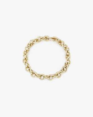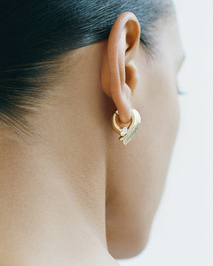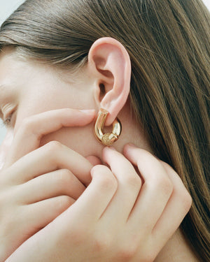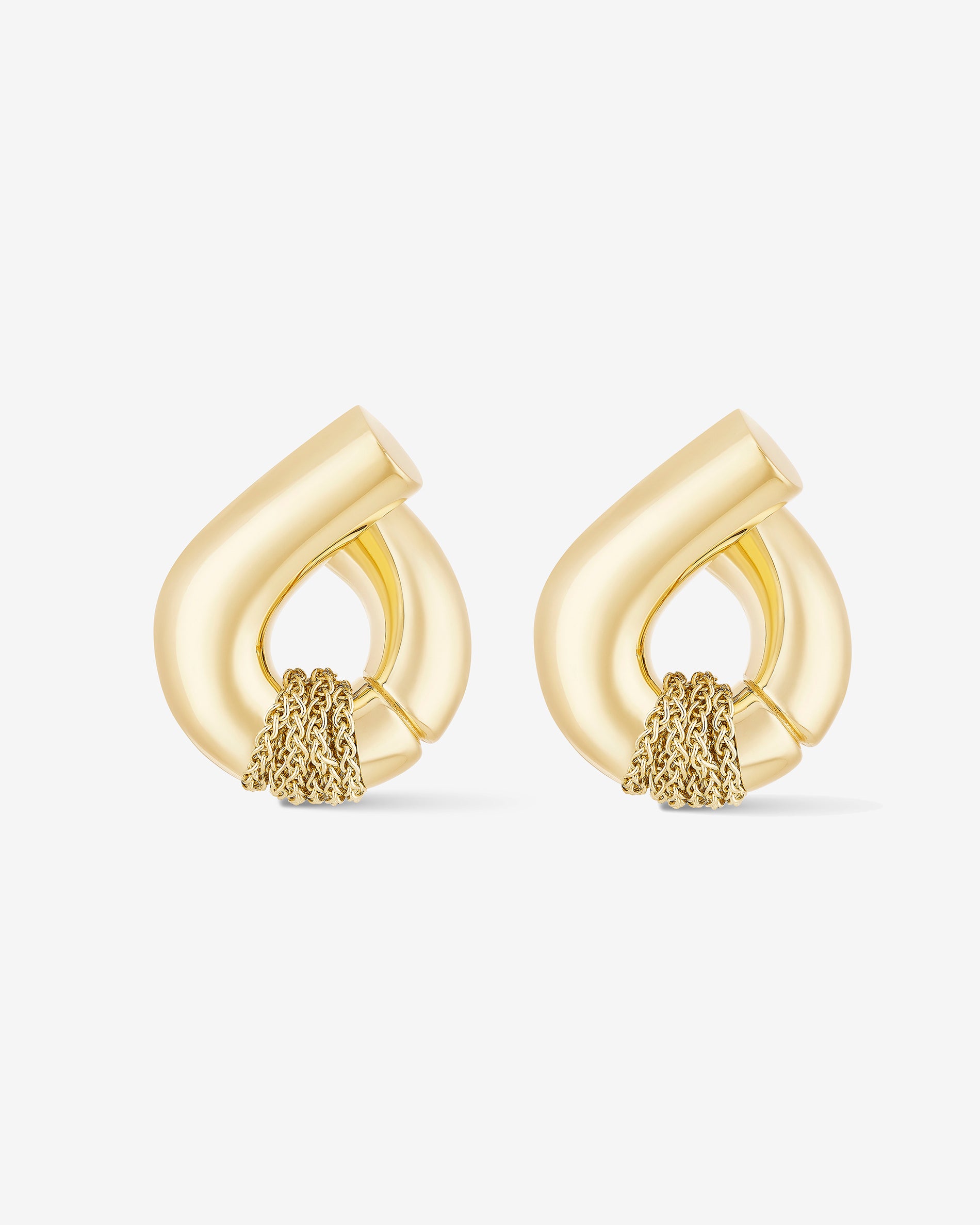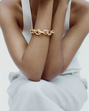 The Oera knot softly coils, binding its wearer in protection. Drawn from Inanna’s knot, symbol of an Ancient Mesopotamian goddess, Oera’s unique form becomes a new universal symbol of spiritual protection. Sculpted in lucent yellow gold, the elemental Oera knot curves boldly, its form acquiring a knife’s edge mid-point and resulting in asymmetric ends.