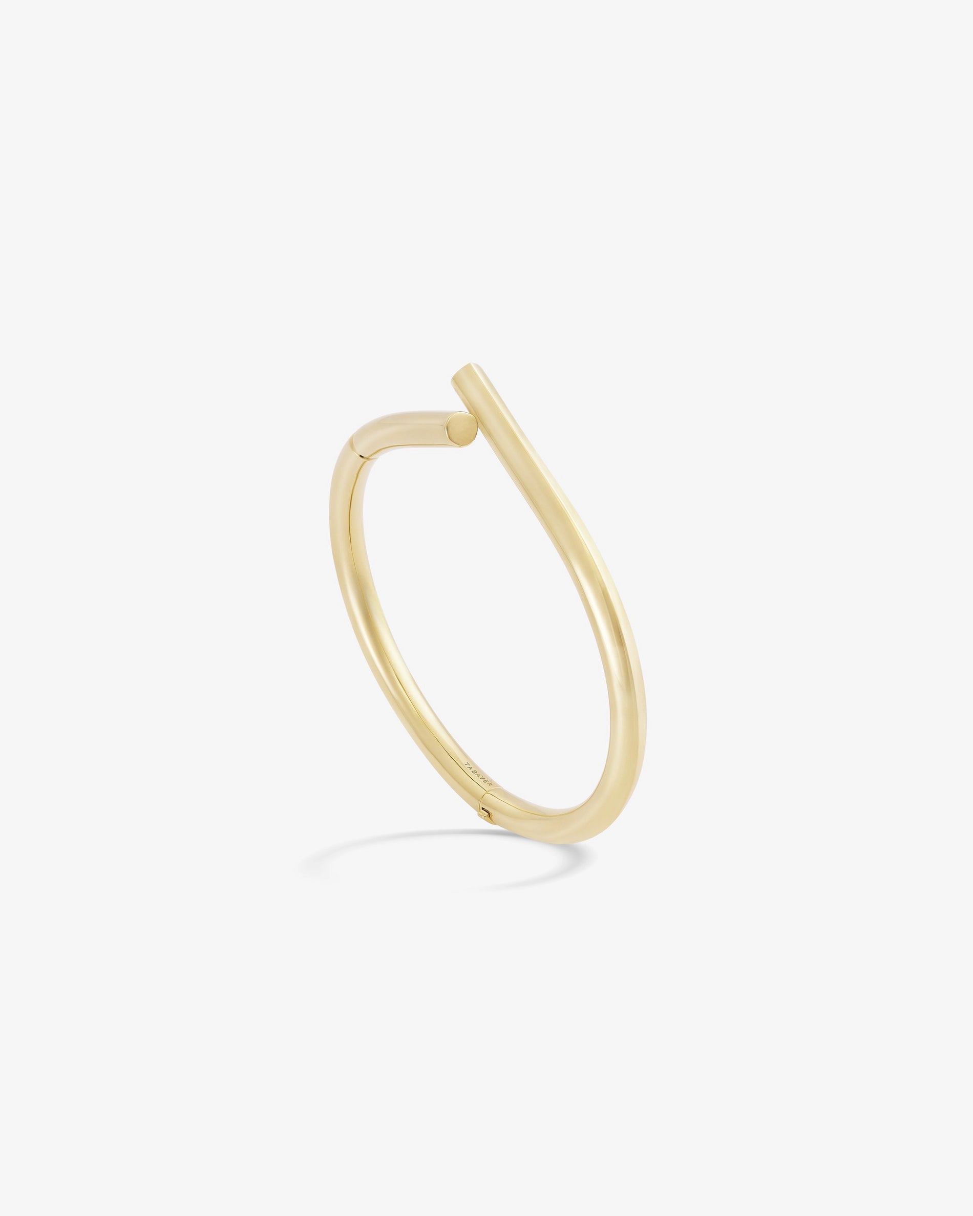 A gold band marks its junctures and comes to touch in the asymmetry of burnished ends.