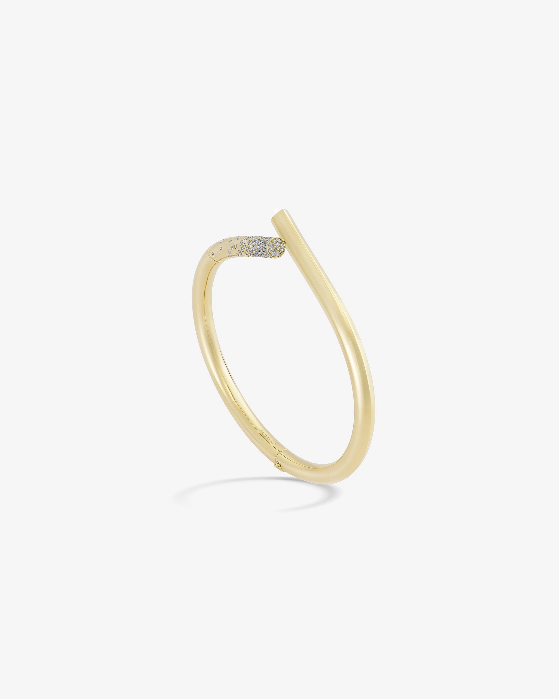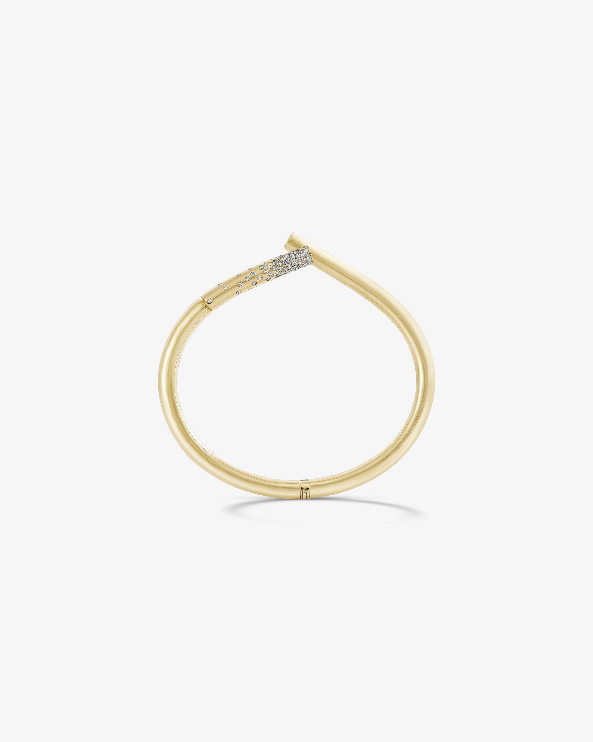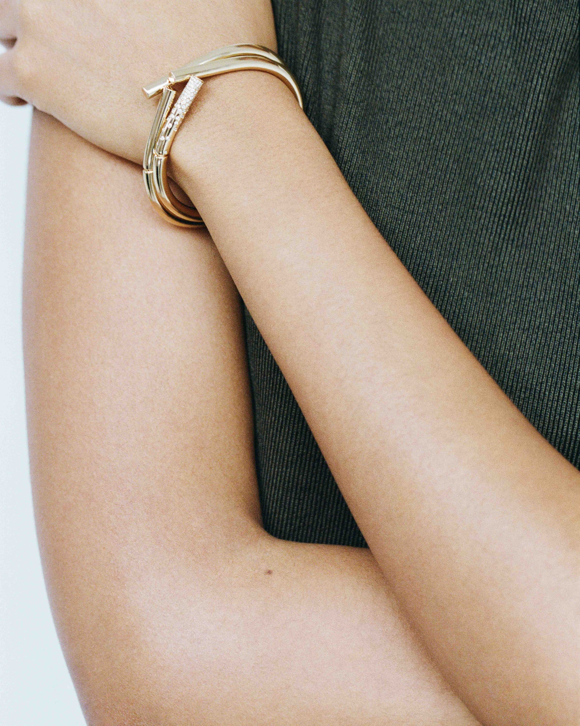 Fine gold forms a nexus and a knot that comes to touch in a smattering of diamonds.
