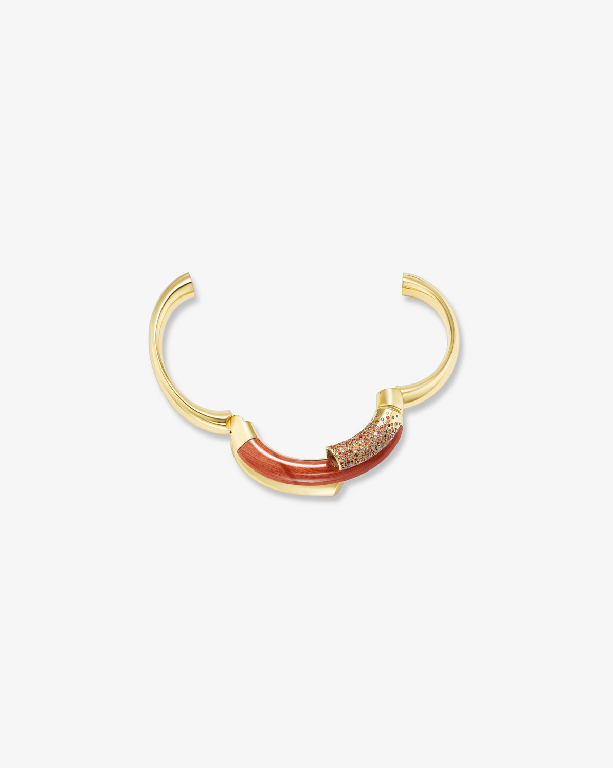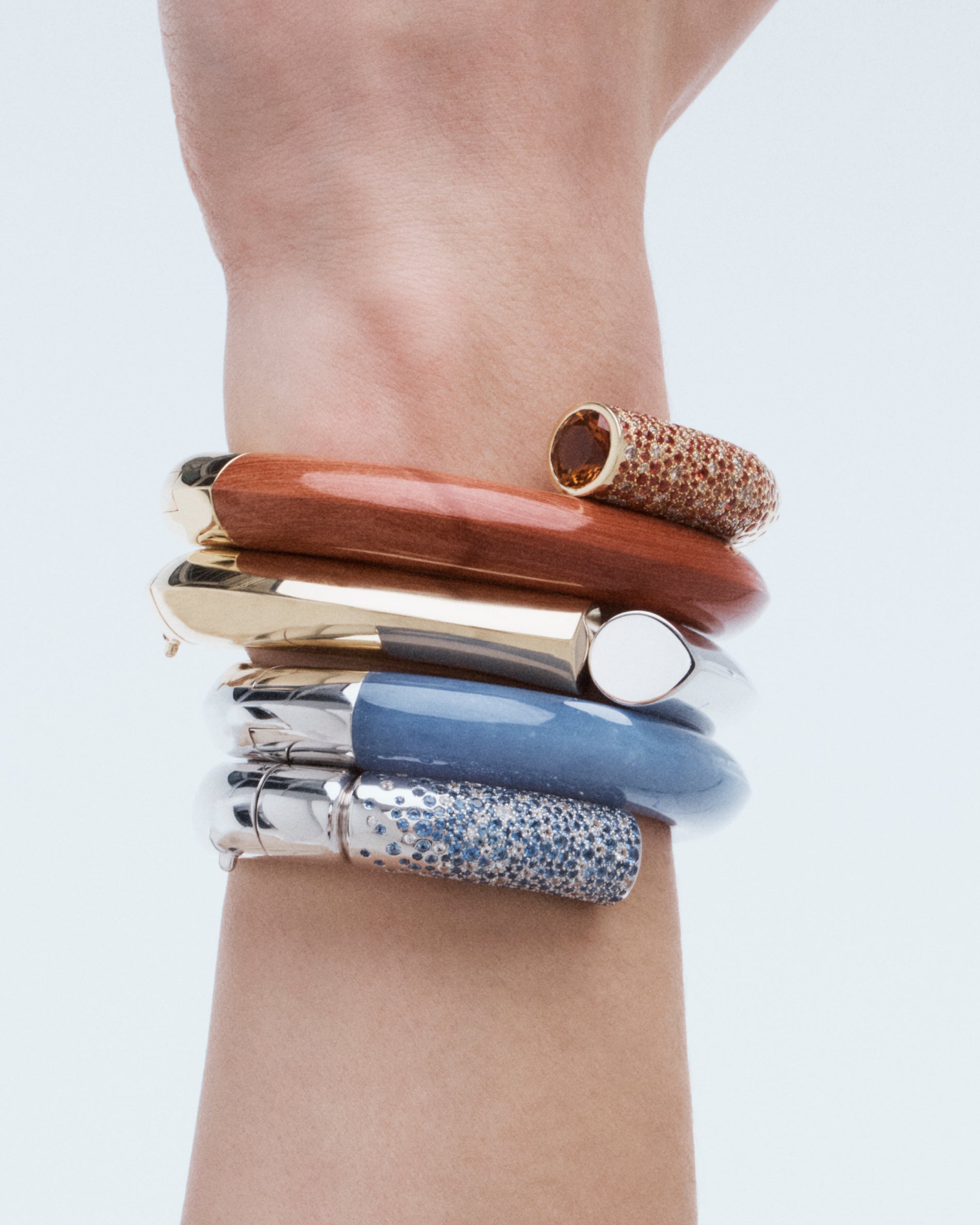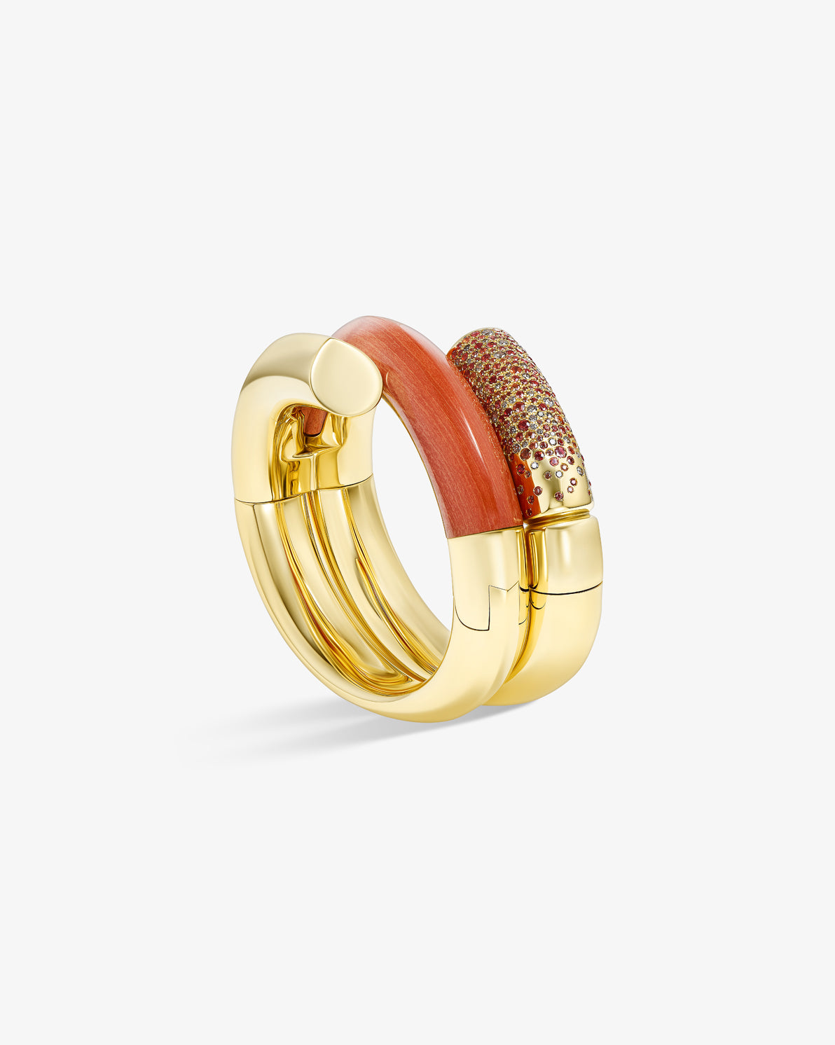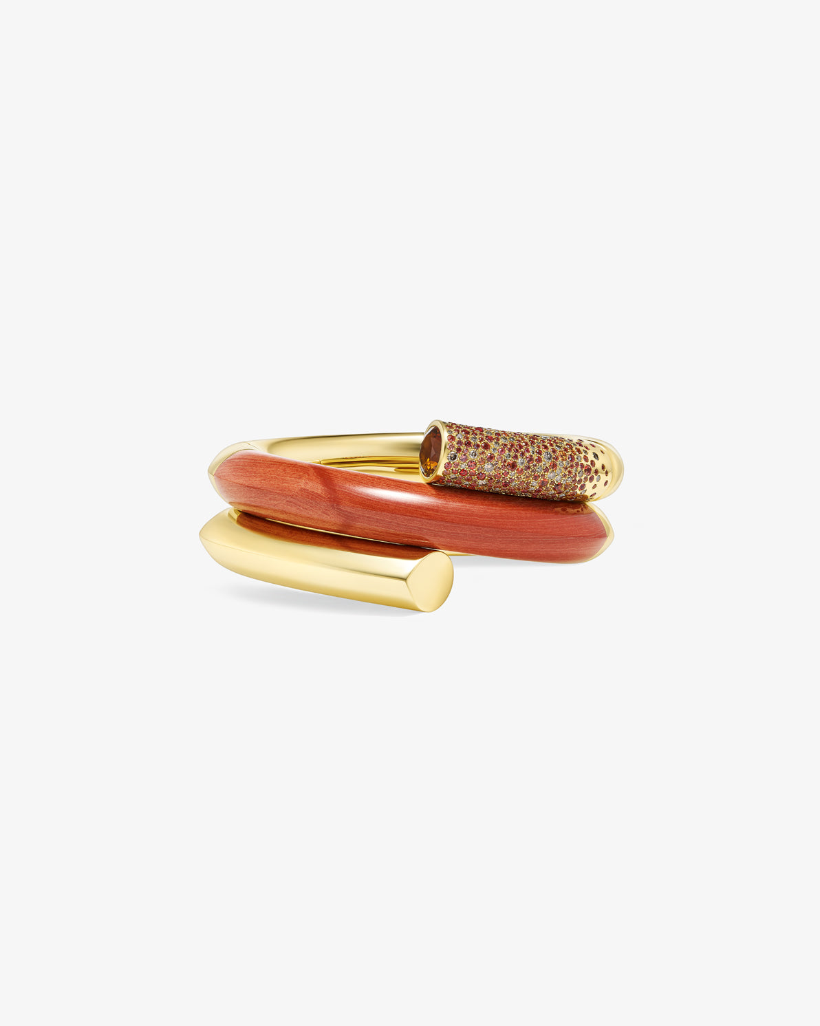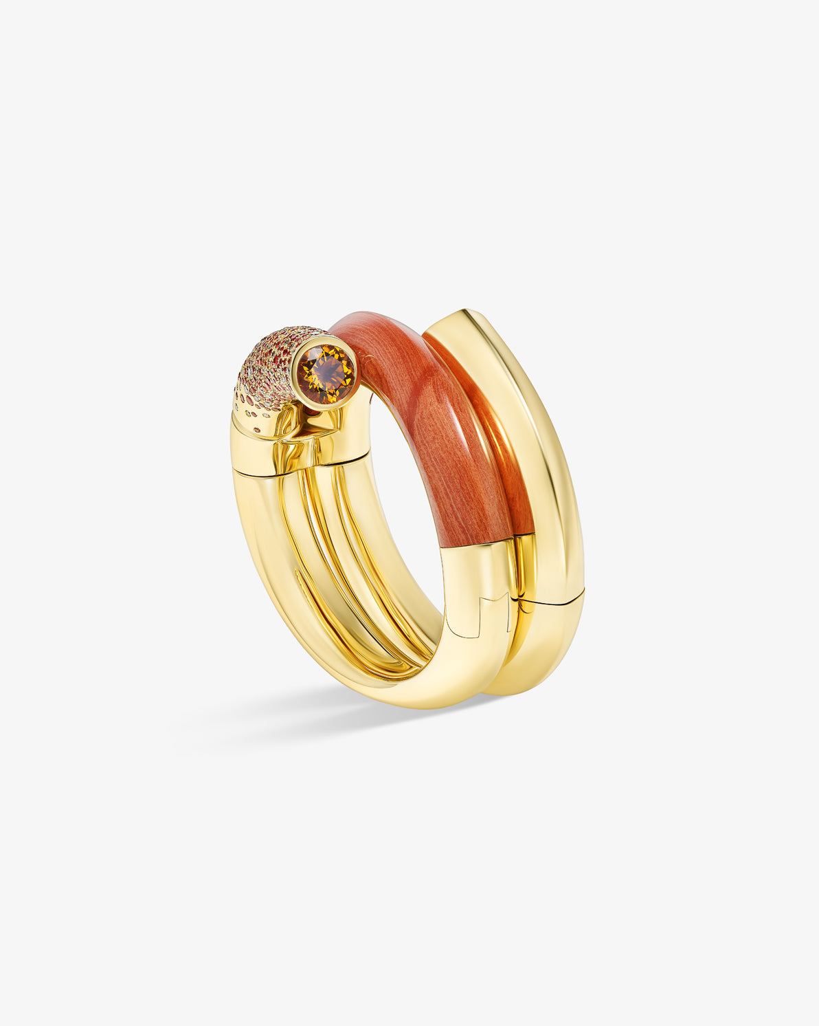 The Oera bracelet's coiled version elegantly combines 18k Fairmined yellow gold with sapphires and brown diamonds, carved red jasper, and finishes with a stunning Madera citrine