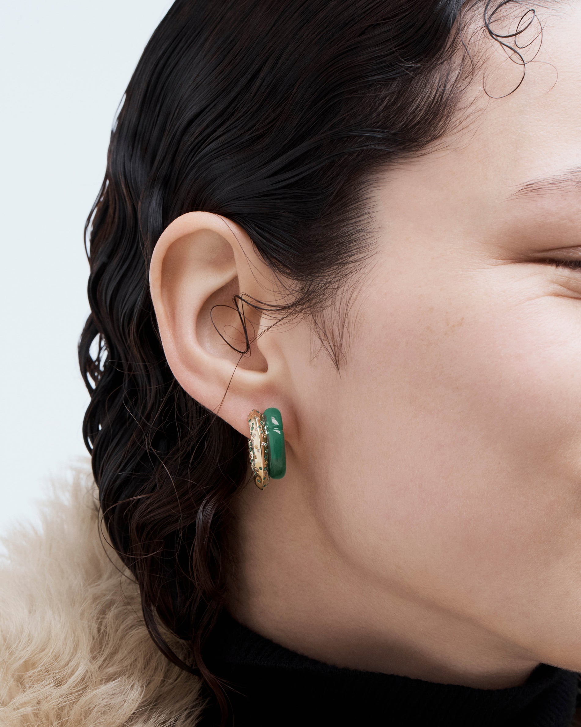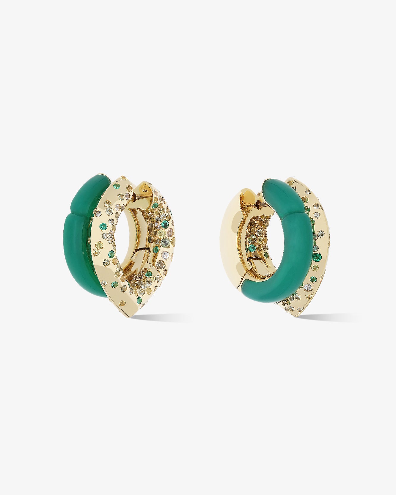 The Oera hoops' coil version delicately combines 18k yellow gold with sapphires and carved green agate