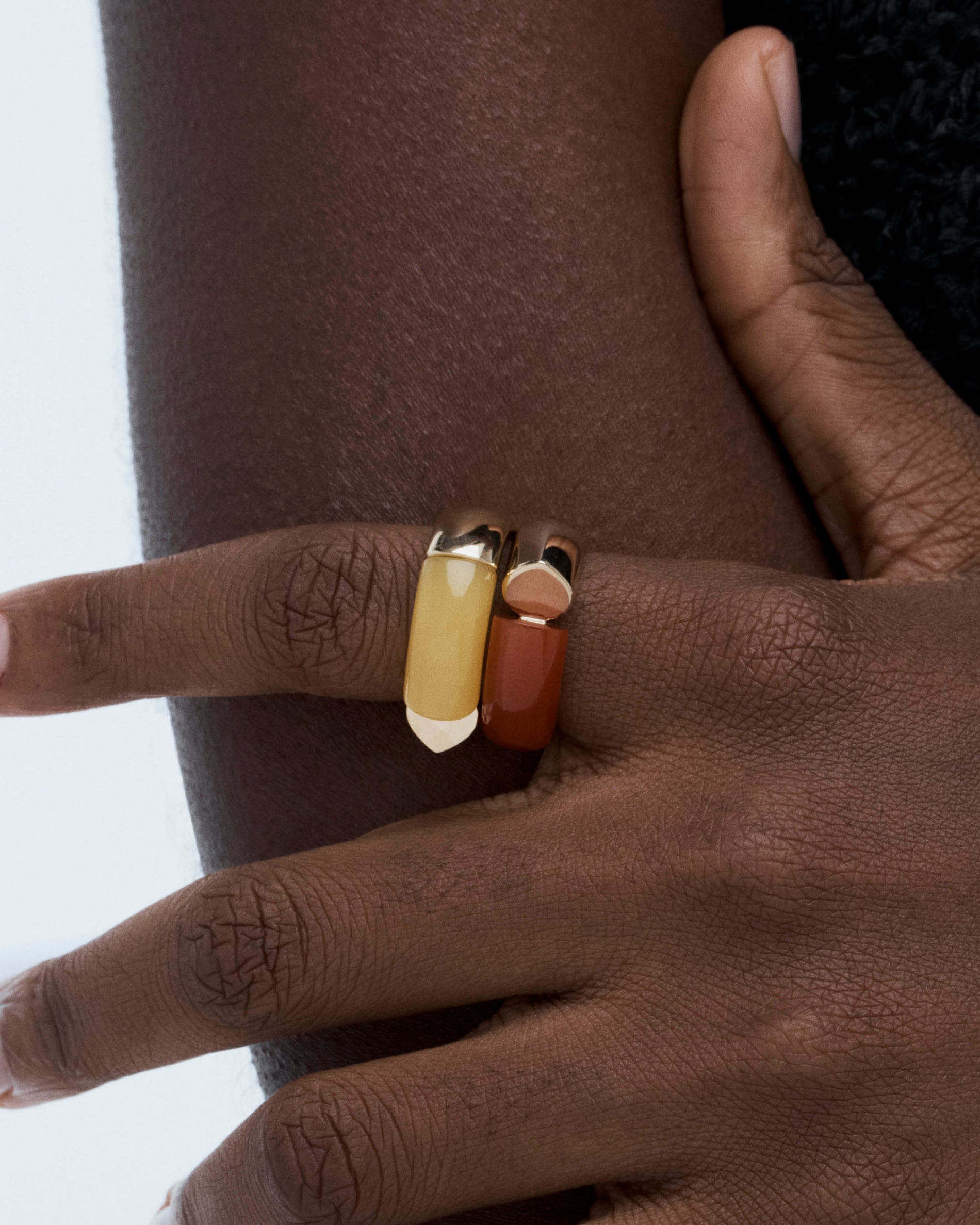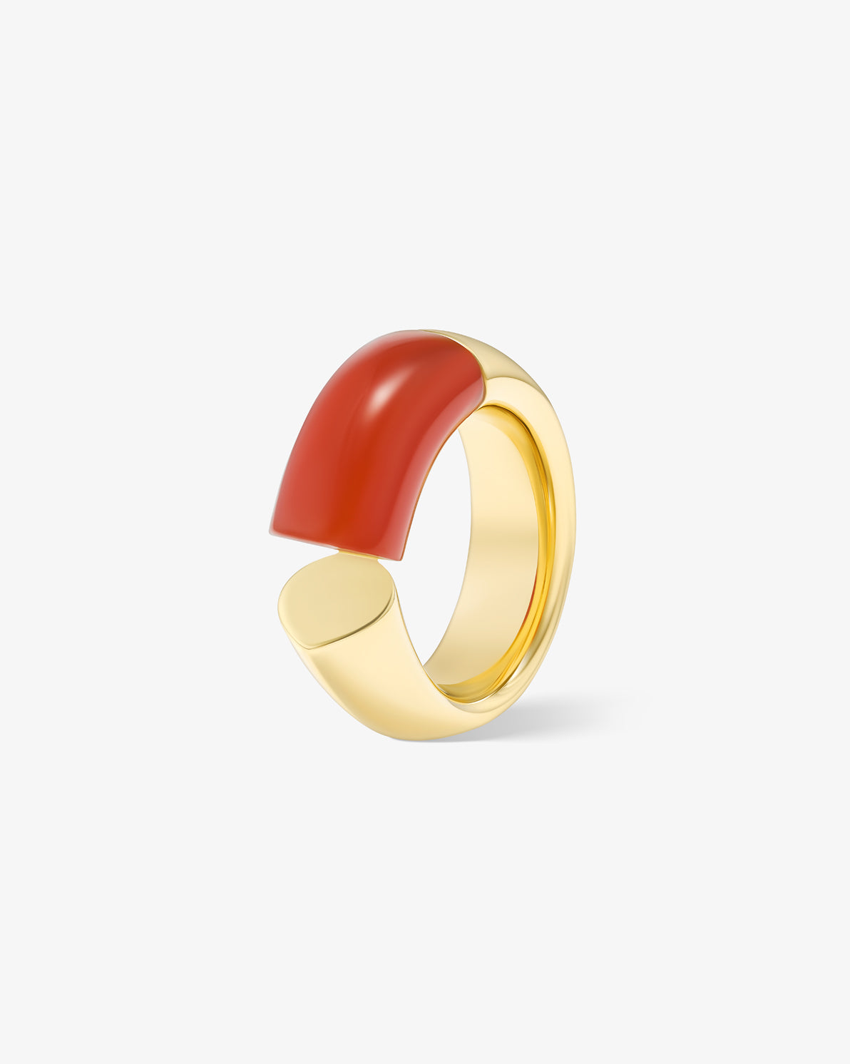 The Oera ring cut-out version, crafted with yellow gold and embellished with the fiery hues of red carnelian