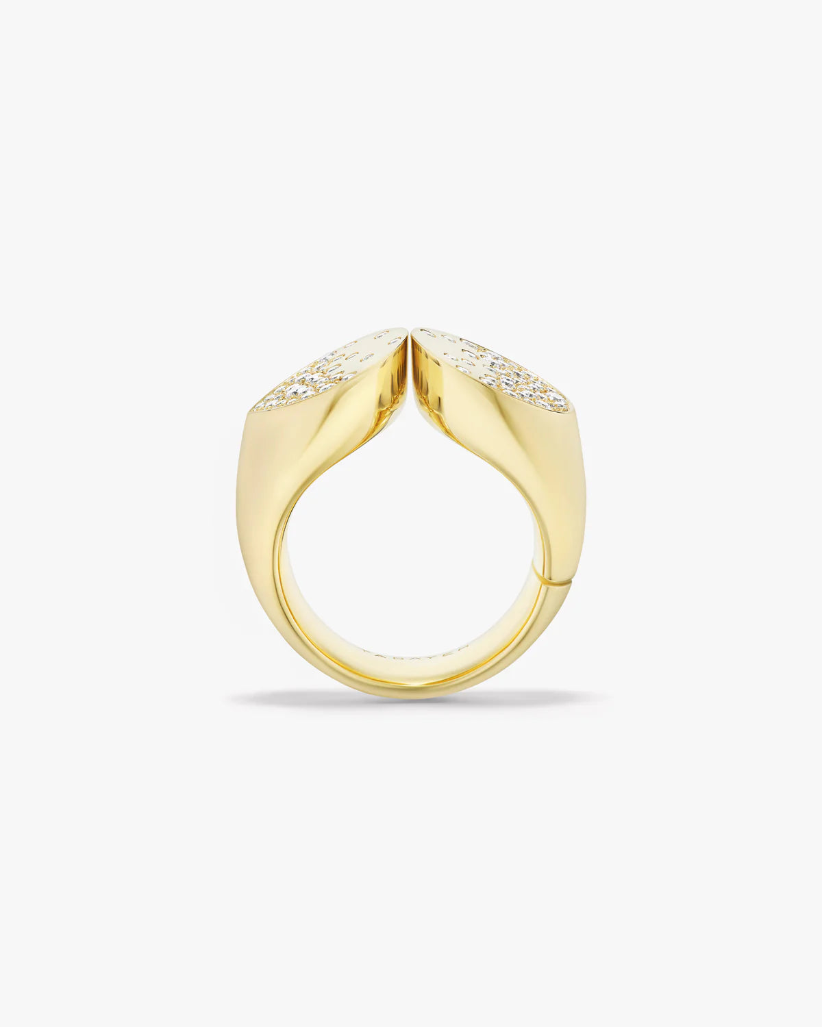 Two signet-inspired ends arc together in a reimagining of the Inanna knot, scattered with white diamonds