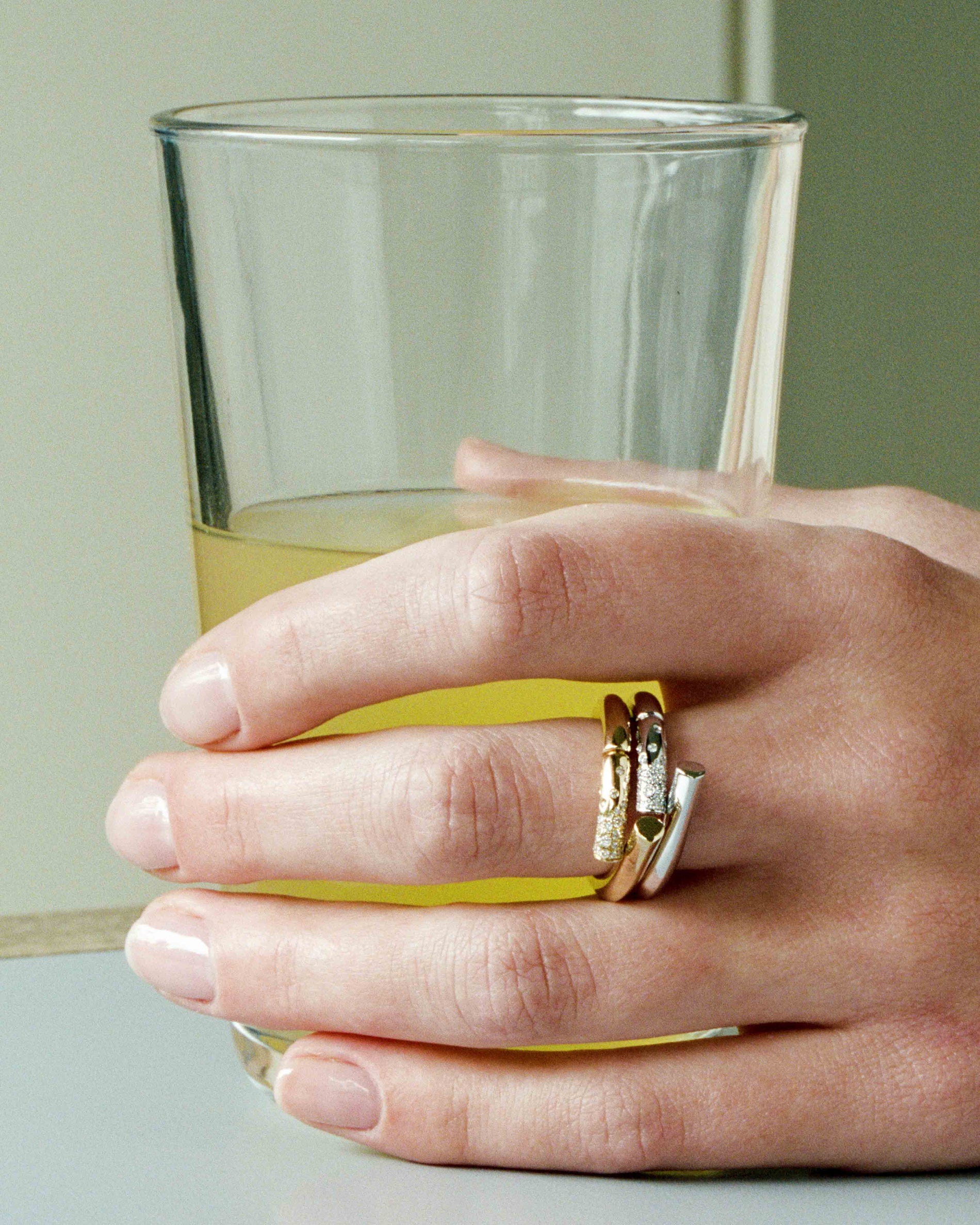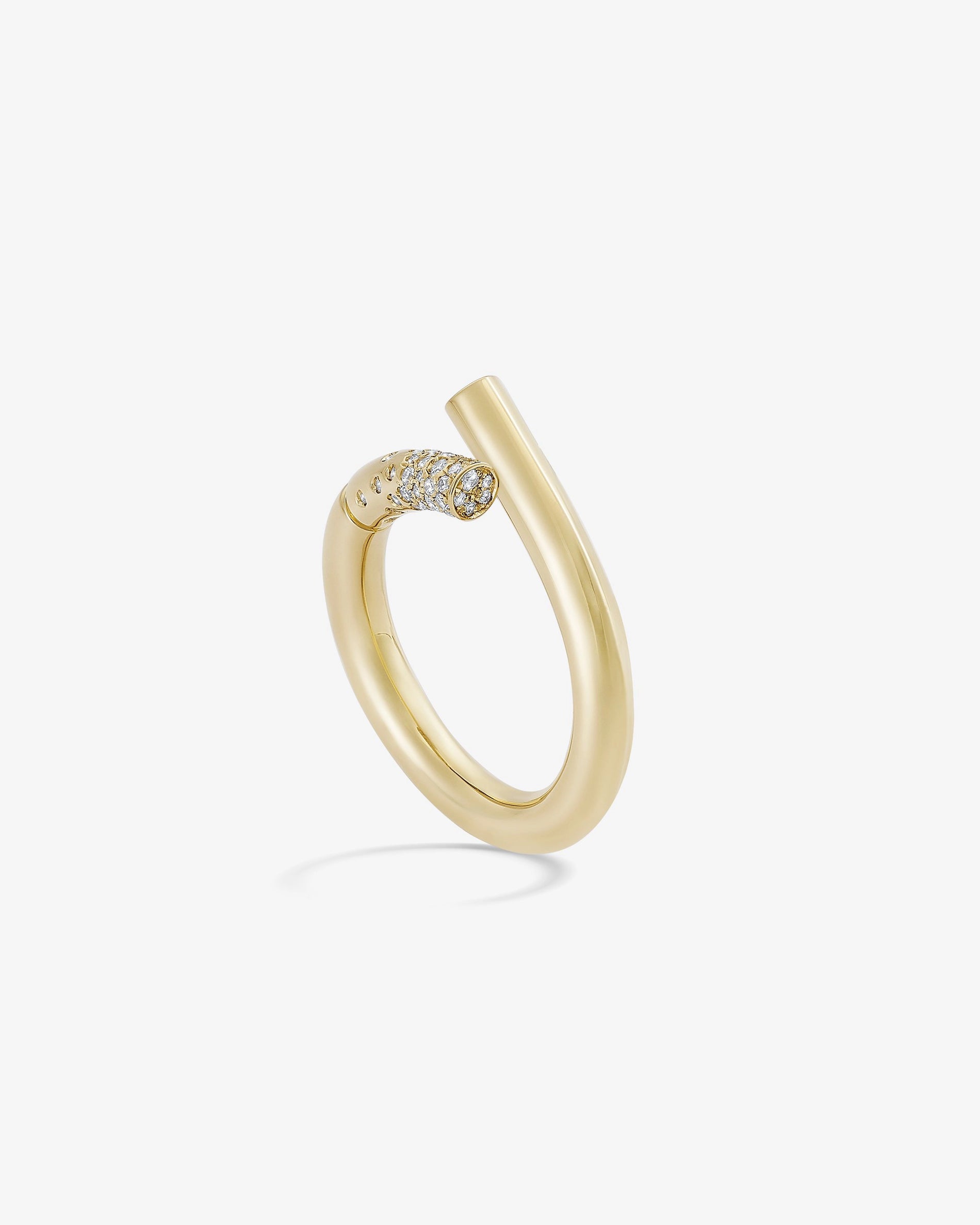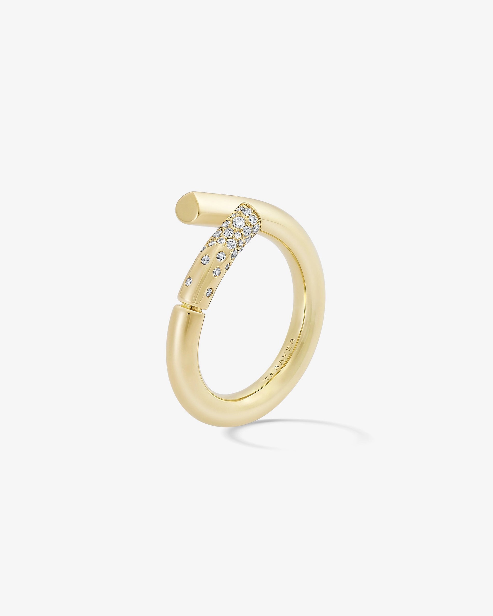 The orbit of a burnished gold pave diamond coiled design ring is emblazoned with diamonds.