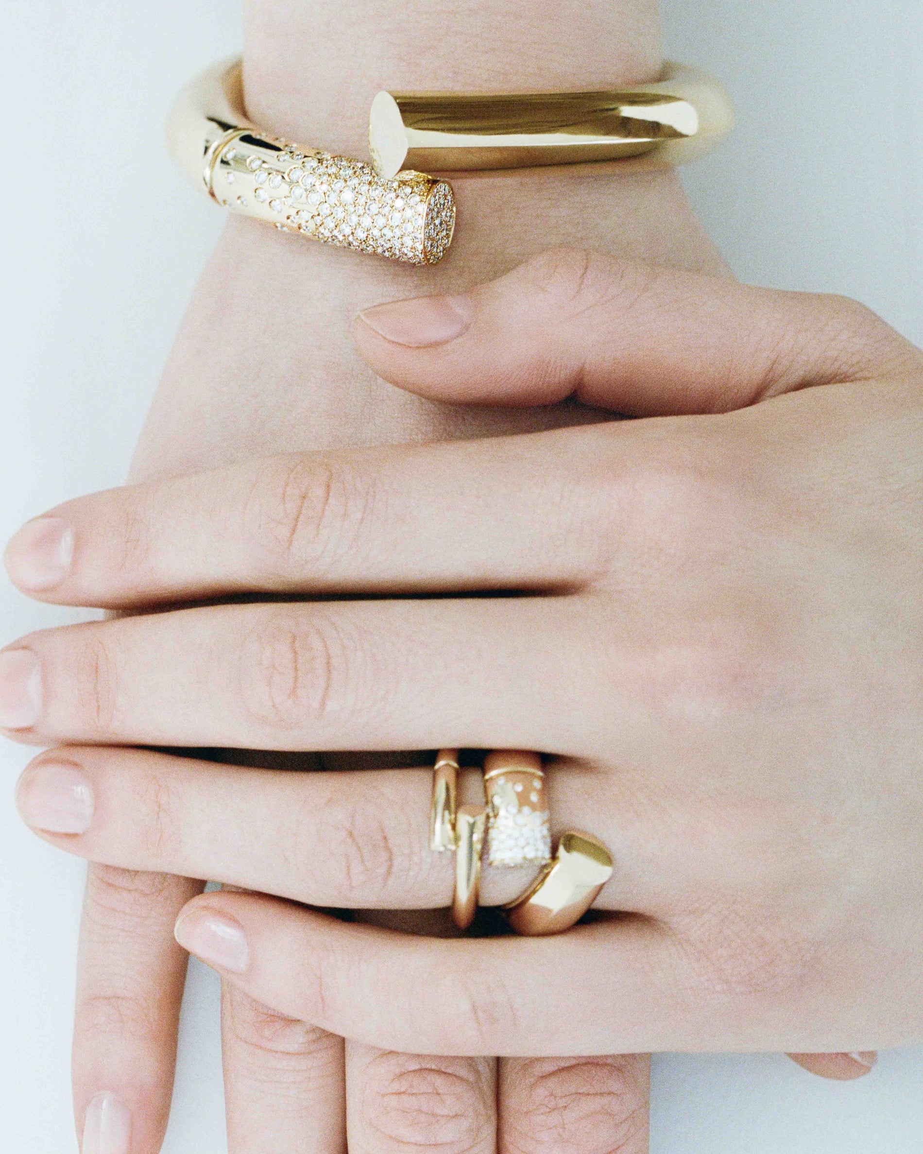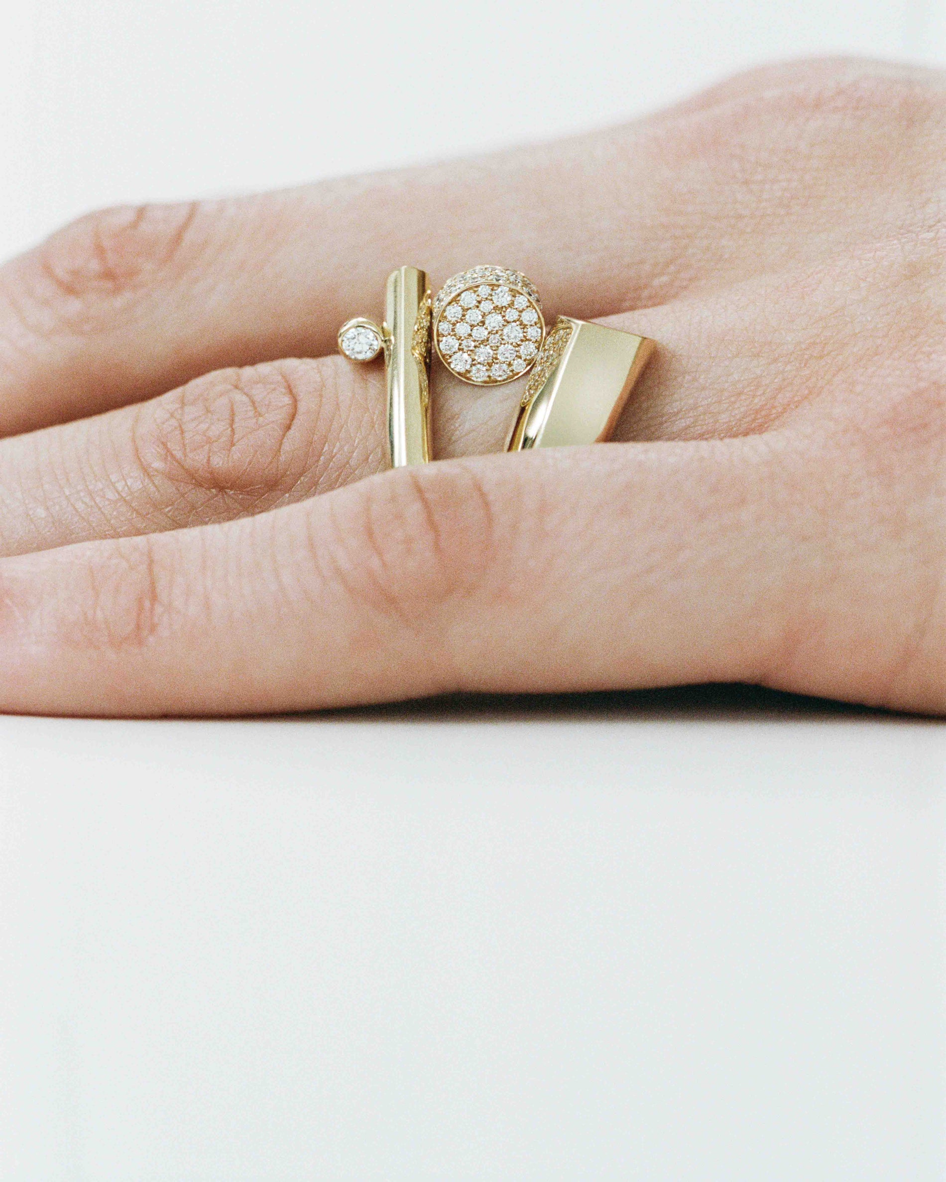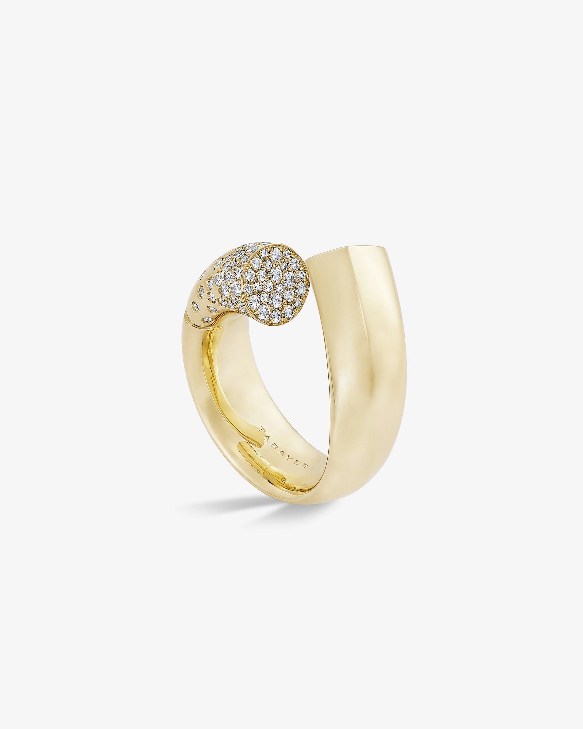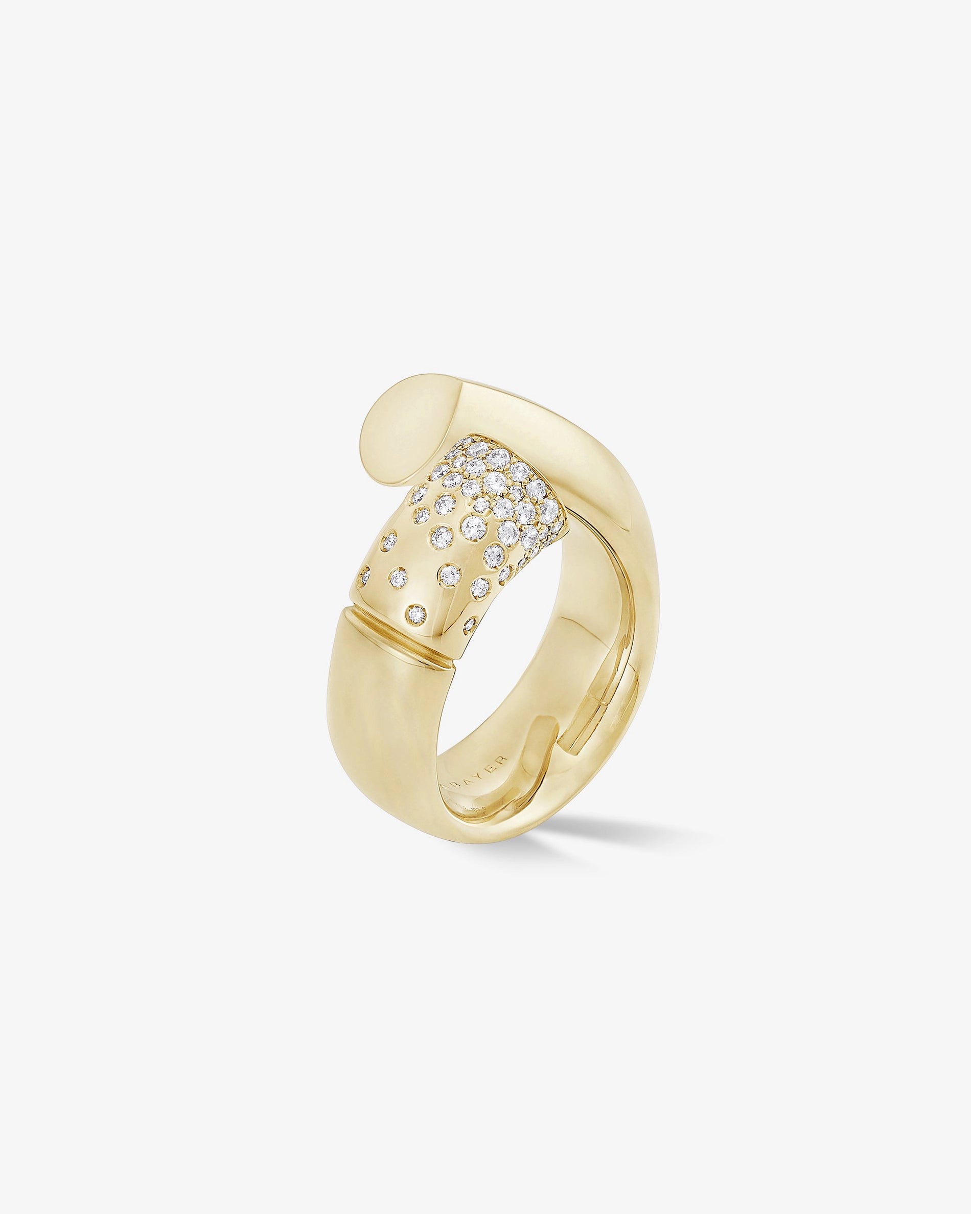 This gold statement ring, set in lucent gold punctuated with scattered diamonds, encircles the finger as if everything were in motion.
