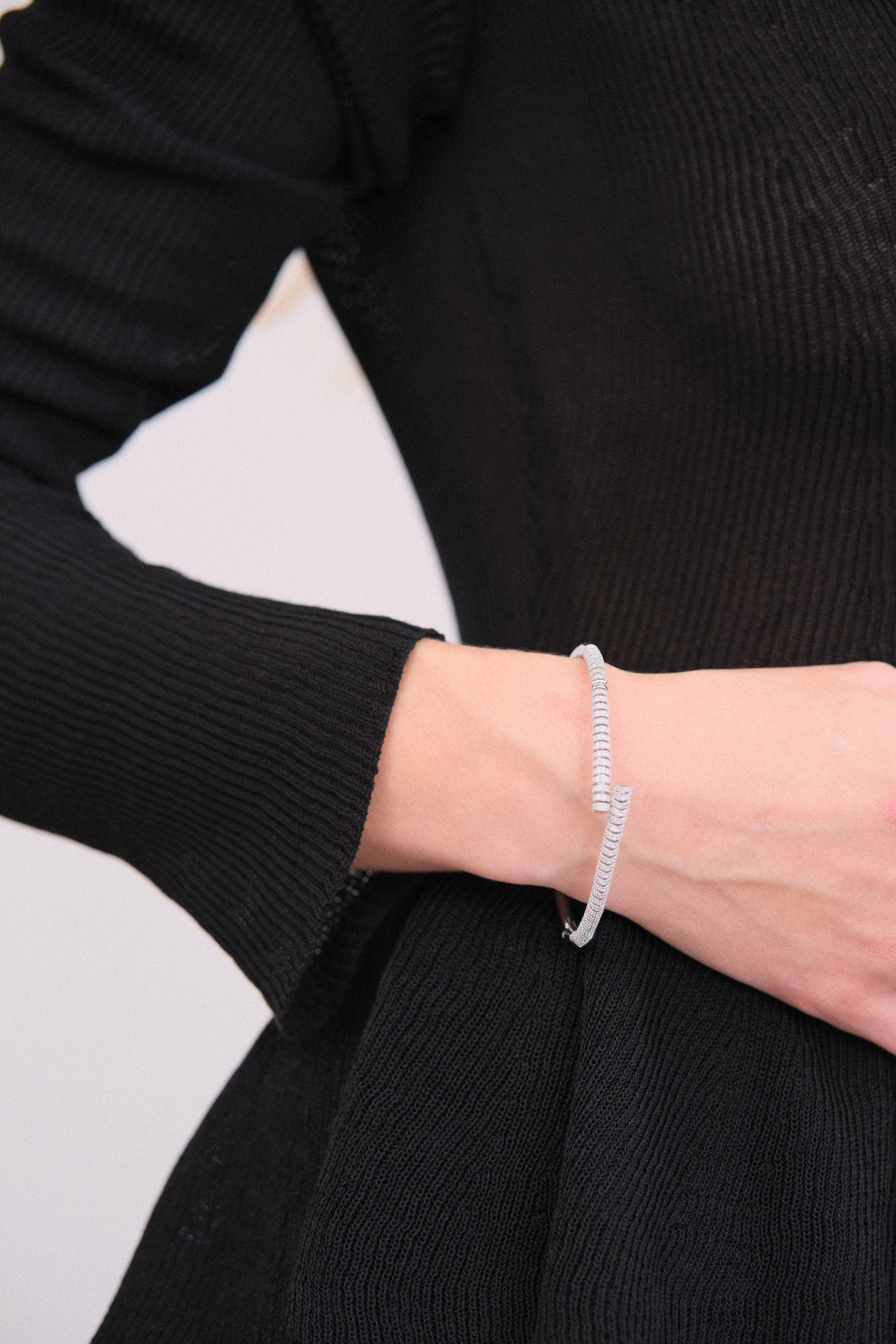 A textured gold bangle draws the eye with its intricate form, its surface adorned with pavé diamonds.