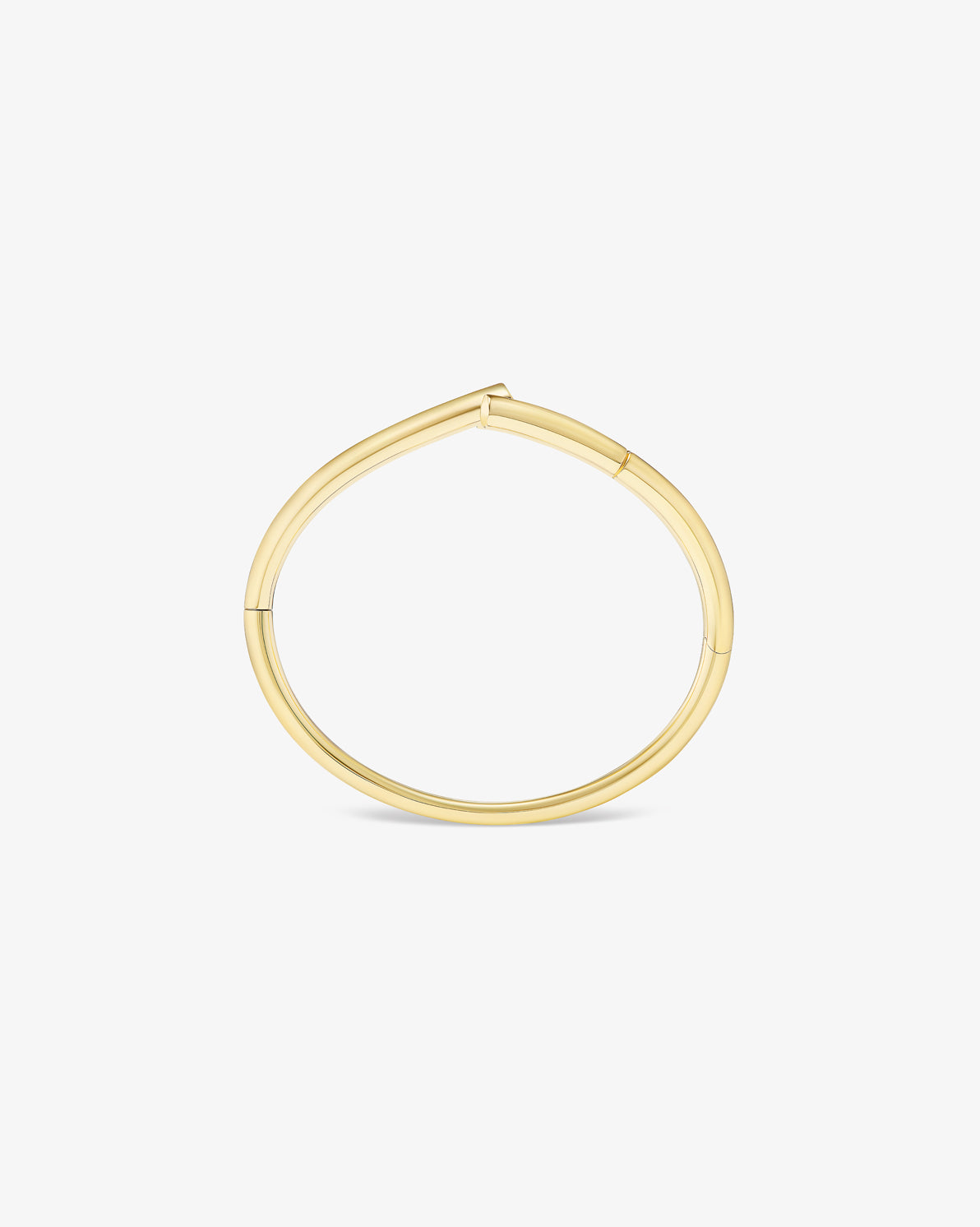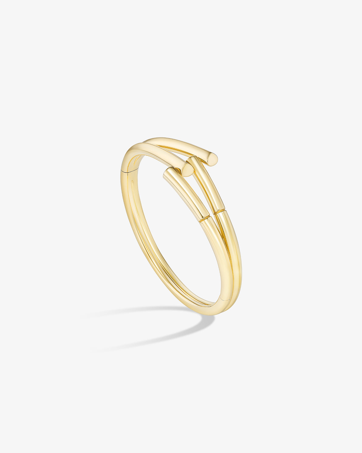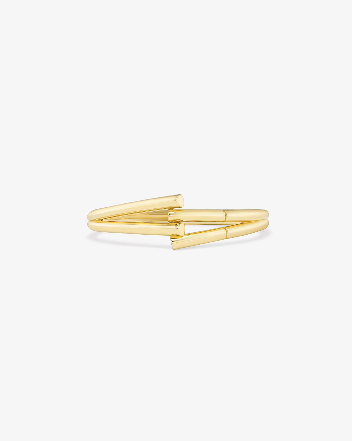 A double bracelet of striking elegance, where two fluid bands intertwine, their paths marked by a single gold clasp.