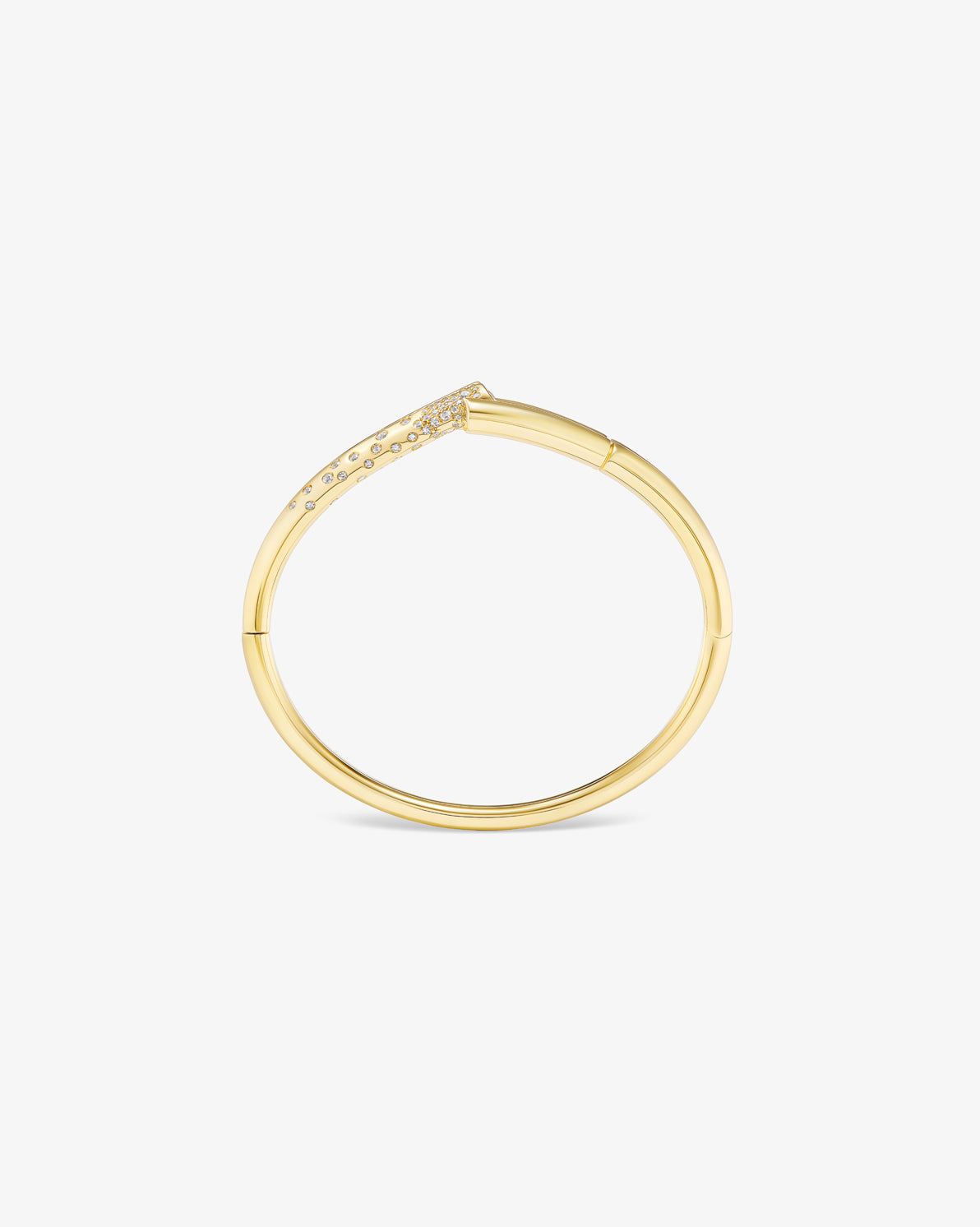 A double bracelet of striking elegance, where two fluid bands intertwine, their paths marked by a single gold clasp.