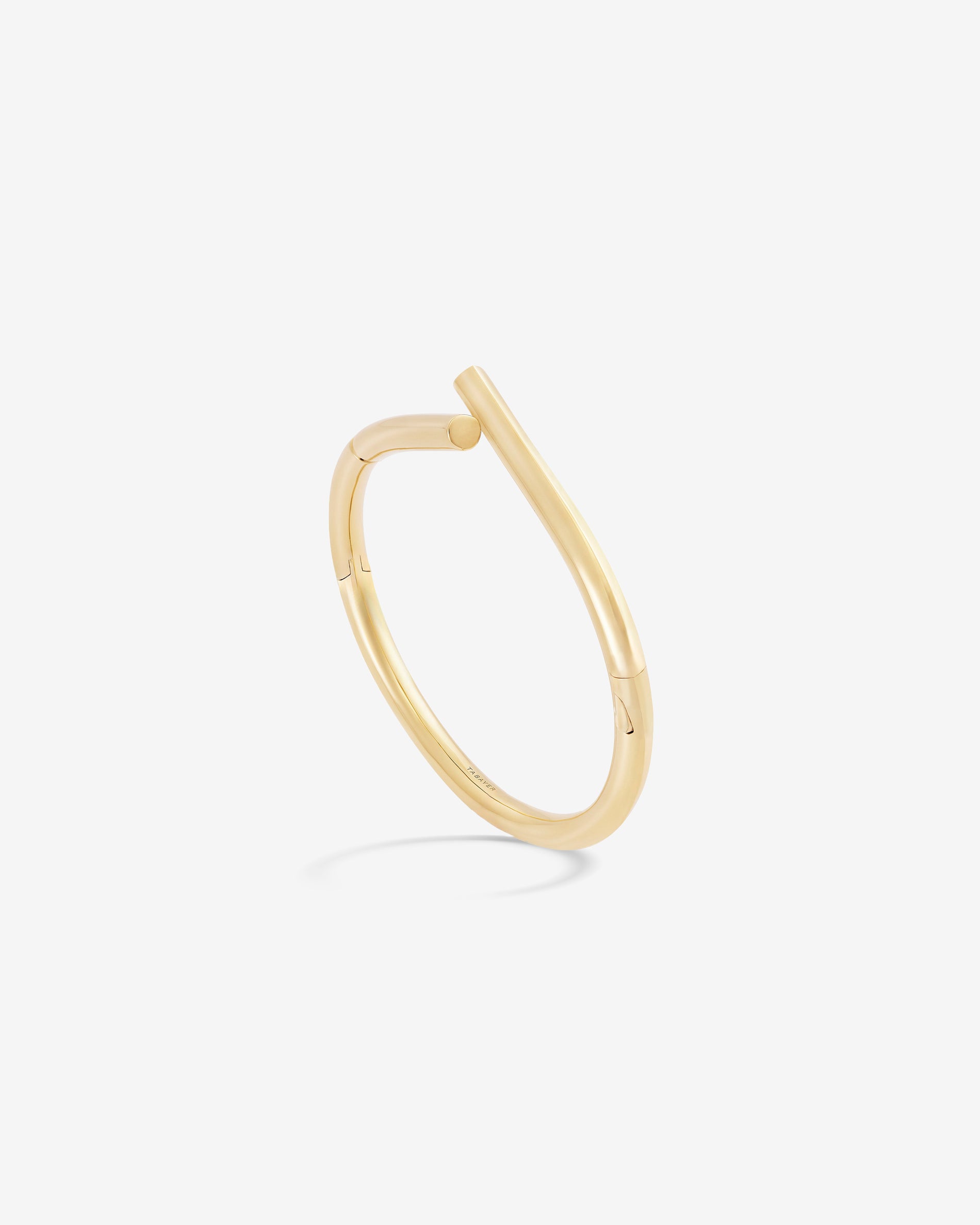 A gold band marks its junctures and comes to touch in the asymmetry of burnished ends.