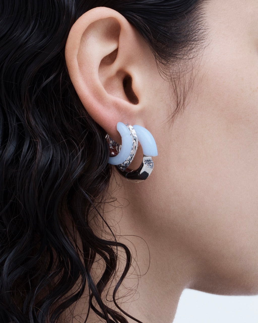 The Oera earrings feature a cut-out design made with 18k white gold and adorned with the serene hues of white chalcedony, with sapphires peeking out from the cut