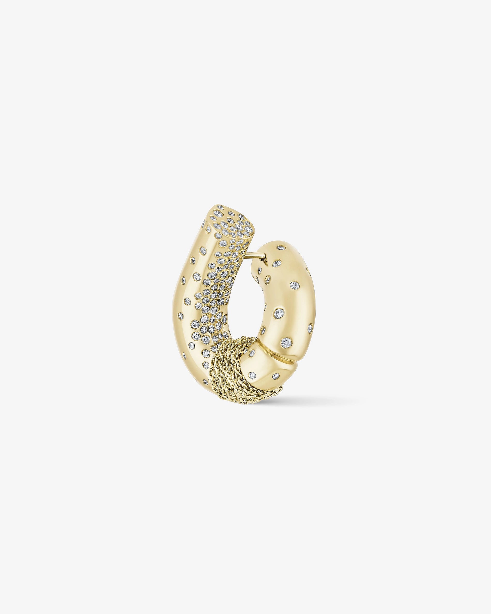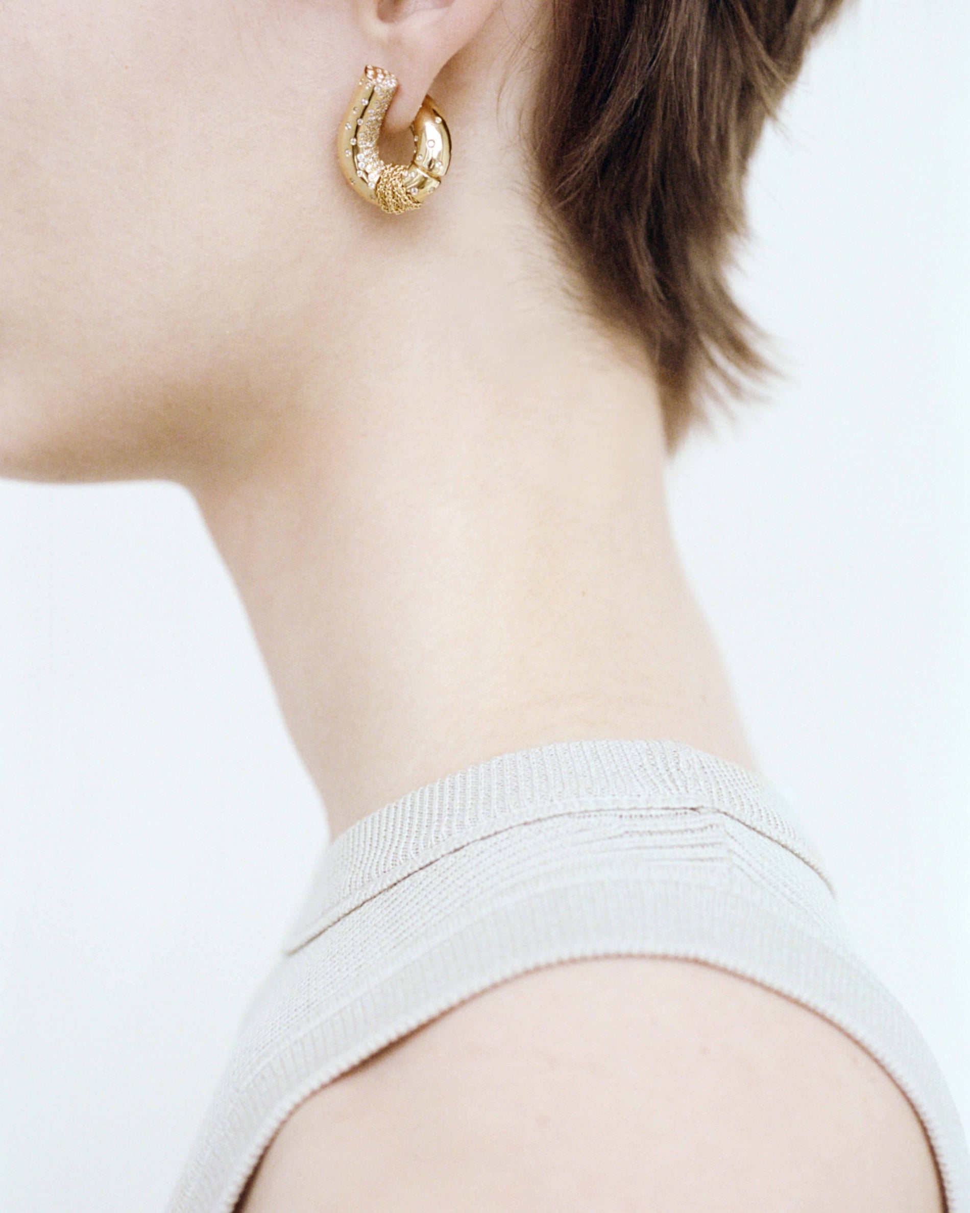 A protective knot forms an interpretation on a hoop earring, embellished with the textural play of chain wrapping and burnished in Fairmined gold.