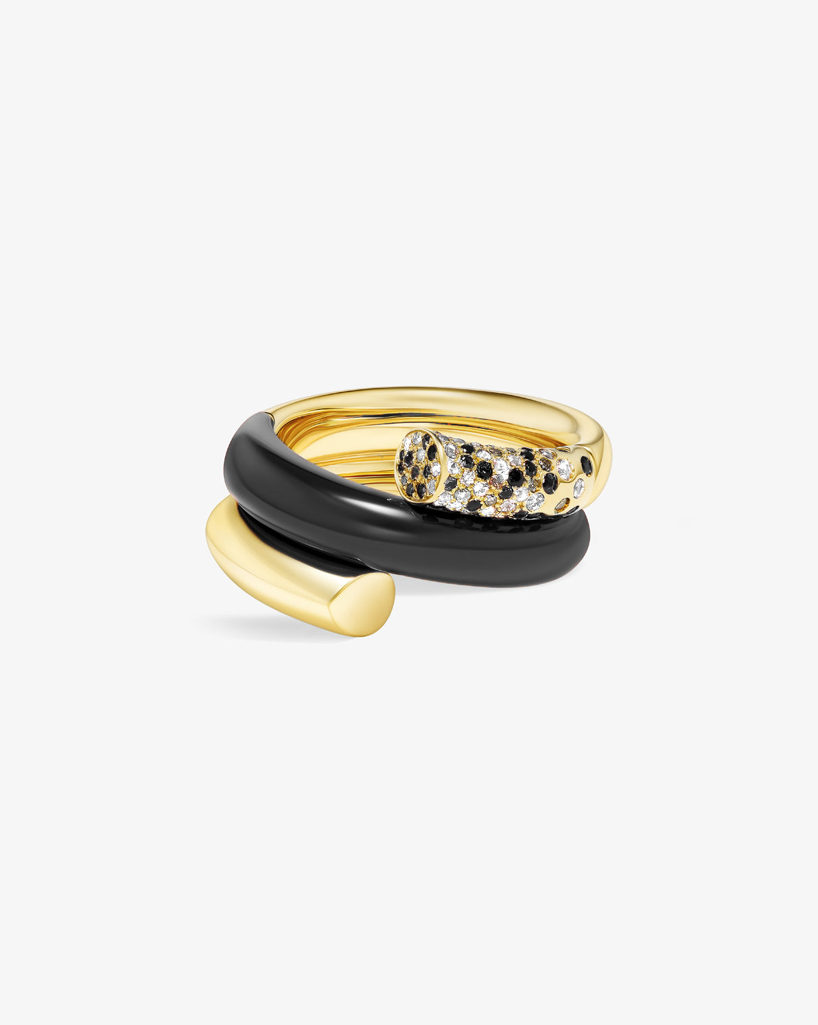 The Oera ring's coil version delicately combines 18k SMO yellow gold with diamonds and carved black agate