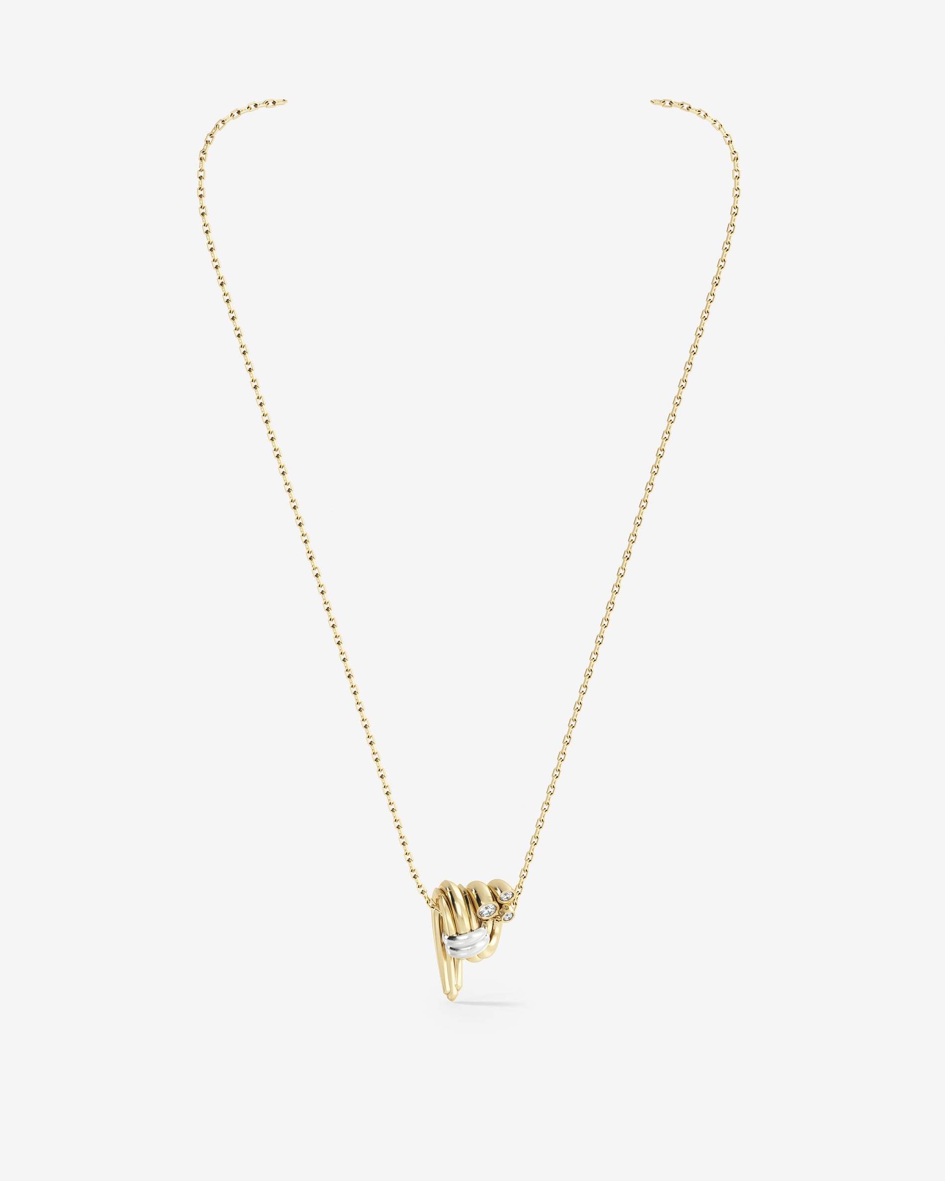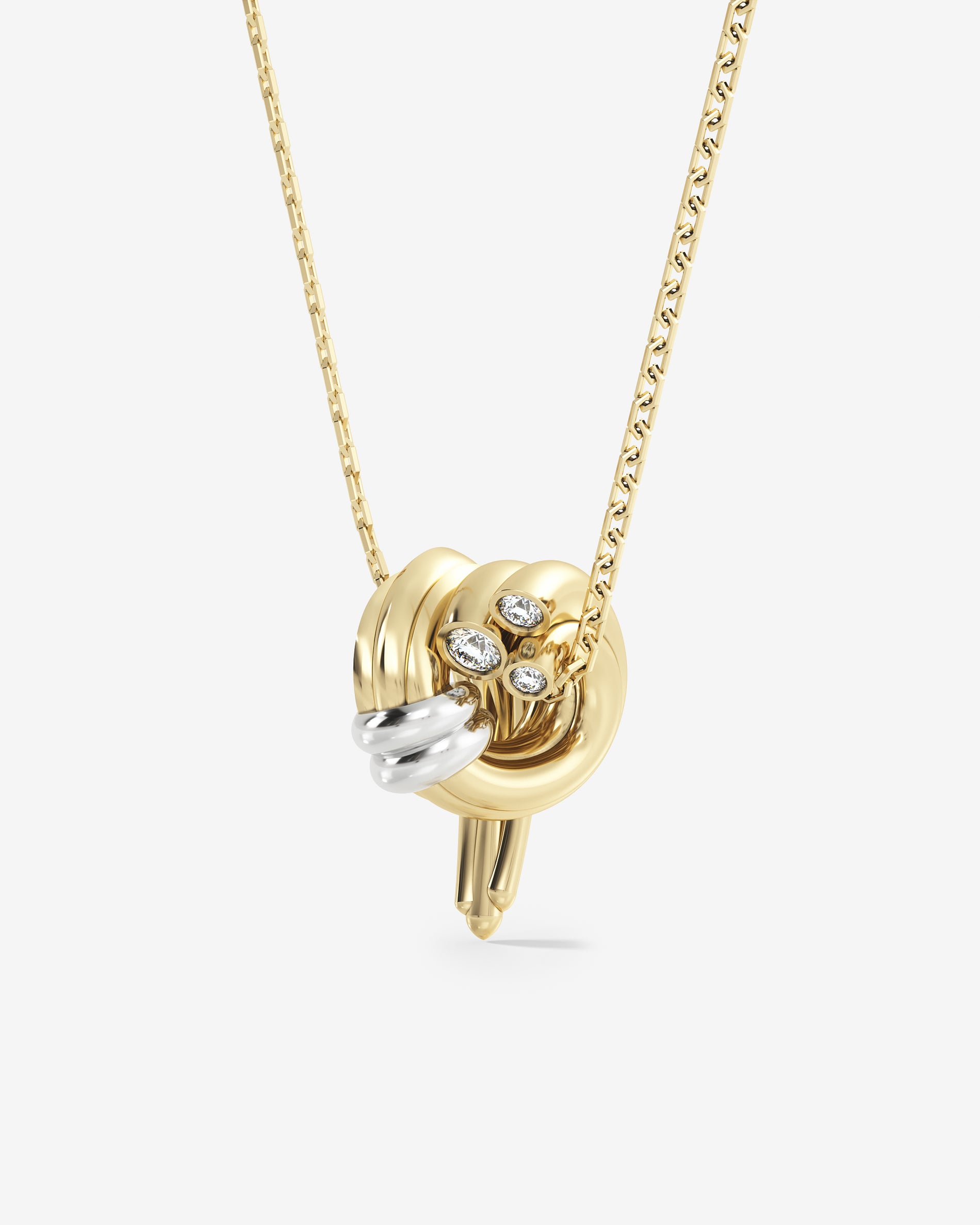 Inspired by the bound sheaf, this pendant in white and yellow gold swirls with intention, elemental, protective, and fluid.