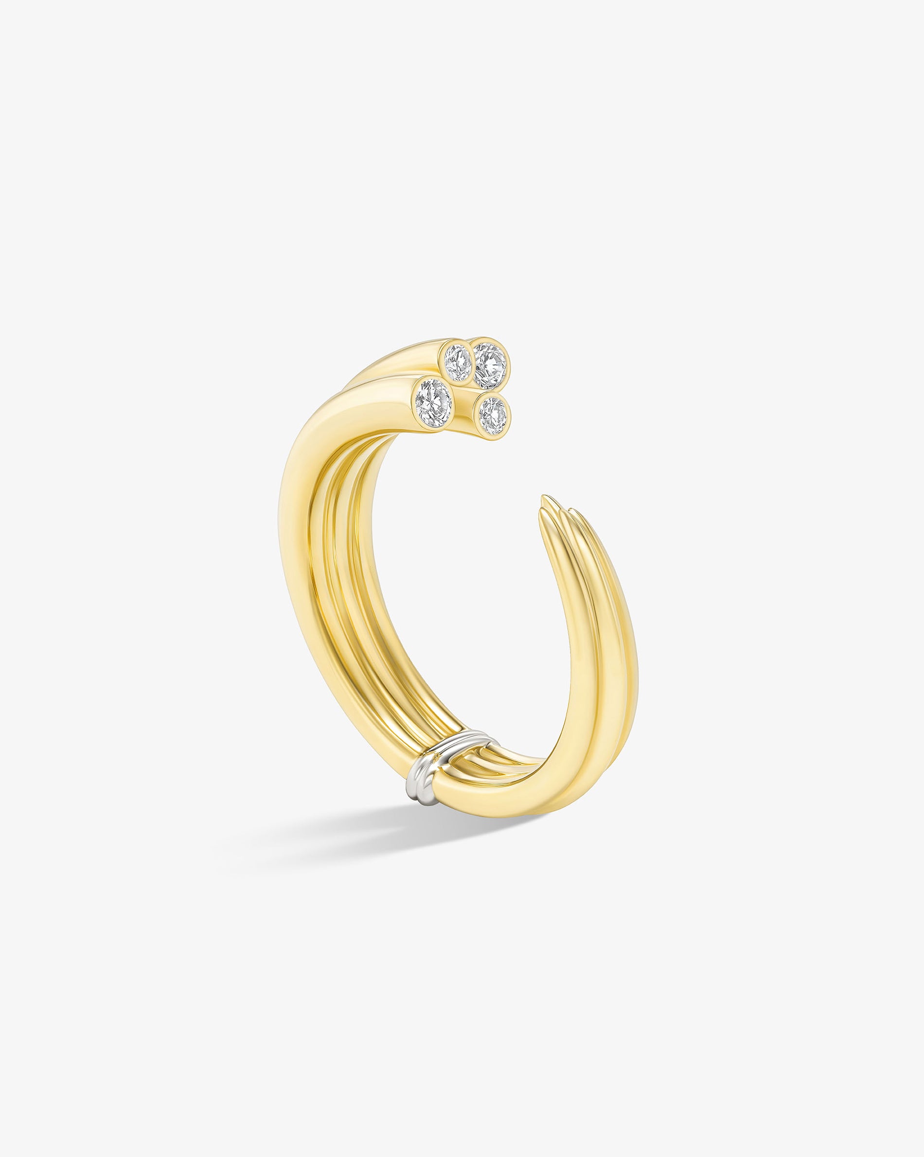 A sculptural gold ring that wraps the finger like a bound sheaf — fluid, protective, and precise.