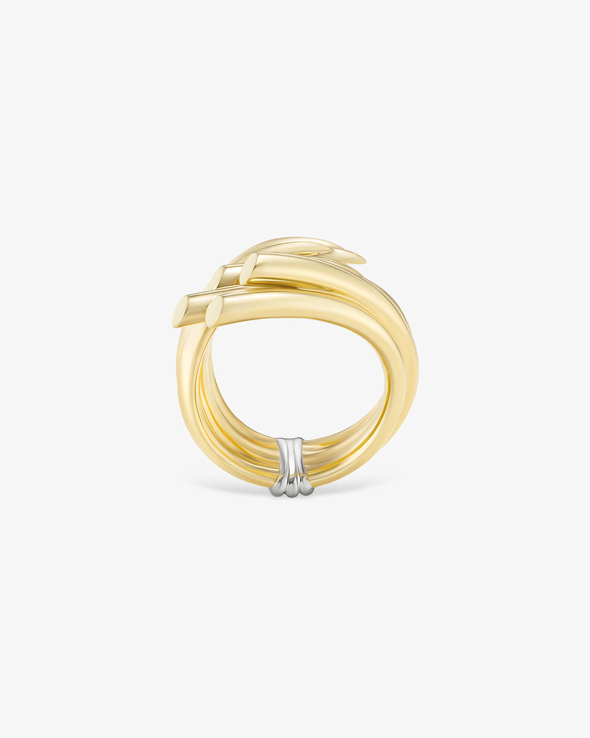 A bold ring forged in 18k gold, its curved planes gather like bound sheafs, forming a sculptural shield around the finger.